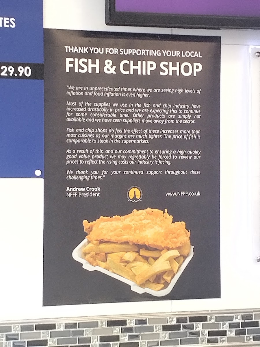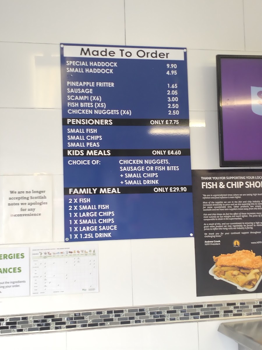 The menu at The Avenue Fish Bar primarily features classic fish and chips offerings, perfect for quick takeaway meals or casual fast food dining. Food options are made to order and include a range of fried items such as haddock portions, scampi, sausage, fish bites, chicken nuggets, and pineapple fritters. Customers can also choose from smaller portion sizes of fish, chips, and peas.